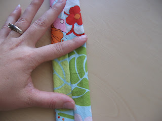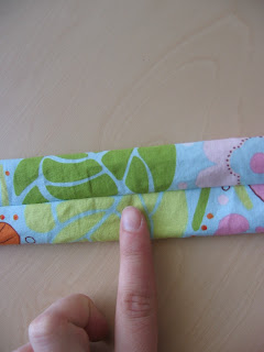 lets work on the straps shall we? ok ... take your shorter strap ( 12 inch) and press in half with right sides together. sew 1/4 inch away from raw edge. turn tube right side out. maneuver the seam so it's going down the middle as depicted in the photo below. press ,then top stitch both long edges.